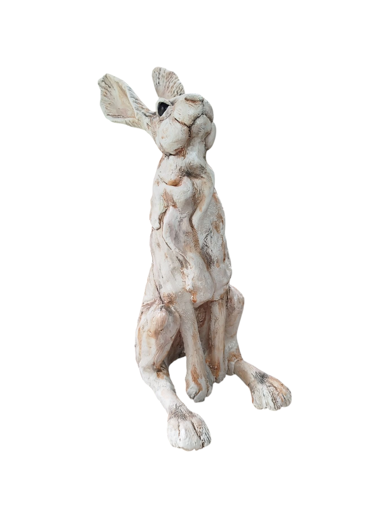 Handmade ceramic hare, glazed with white slip, underglazes, oxides and shimmers.